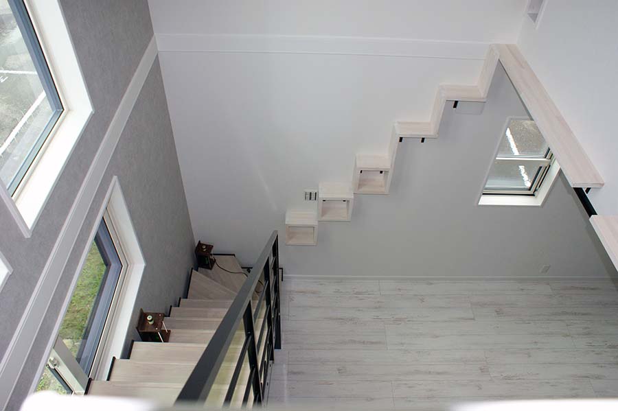 ・リビング上部に開放的な吹抜けを設け、2階には吹抜けに面したセカンドリビングを配置することにより1階とつながった空間、各部屋につながる空間として家族のつながりを作り出します