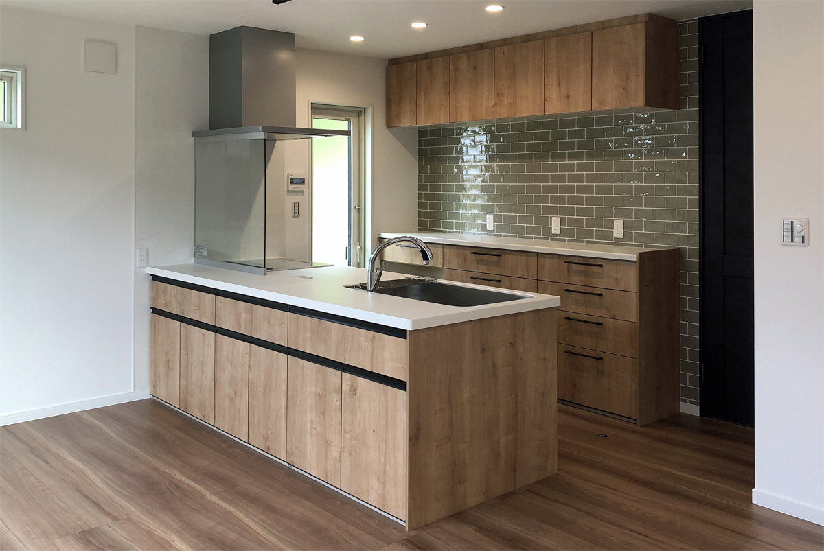 ・キッチン背面はタイルやペンダントライトを用いてカフェ風な雰囲気に