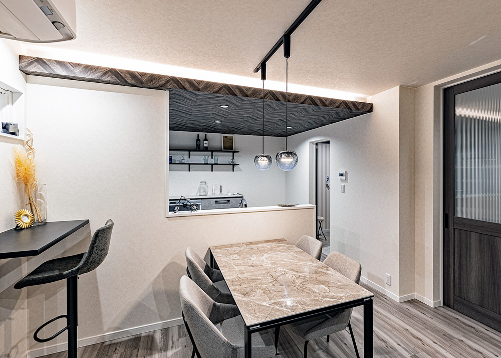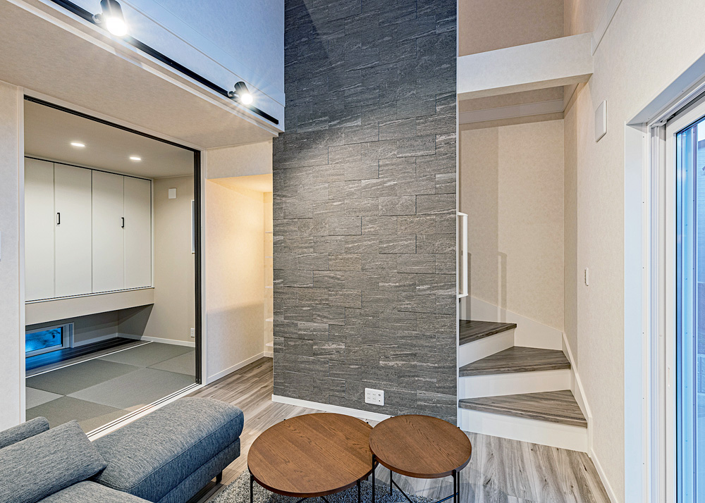 インテリアもホワイト&ストーンを基調とし、ウッドを加えて質感のある空間に仕上げました。『普通の住まいでは物足りない』とお考えの方にお勧めする、ちょっとオシャレな住まい。