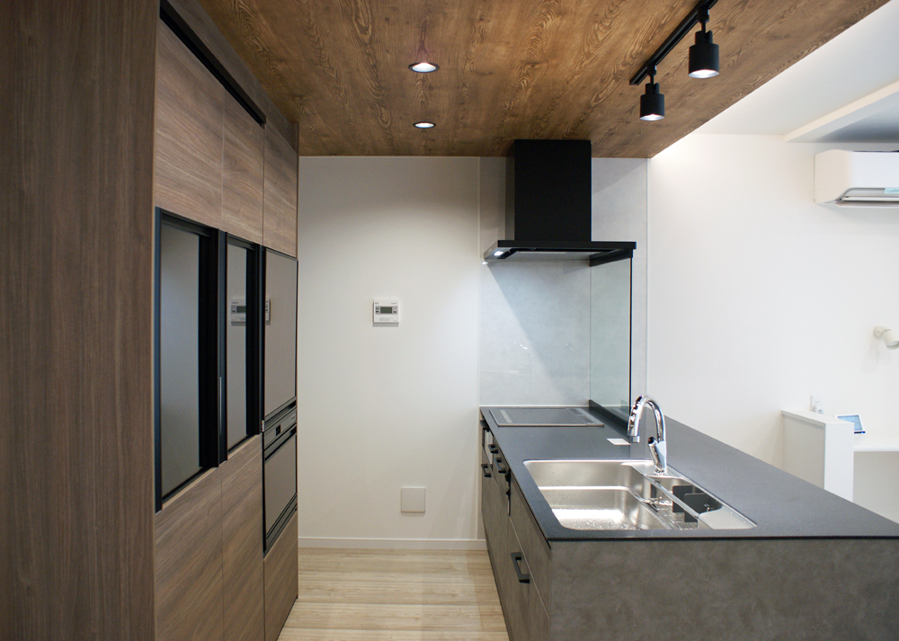 ・キッチンは色味や質感にこだわり、下がり天井と間接照明でオシャレに演出