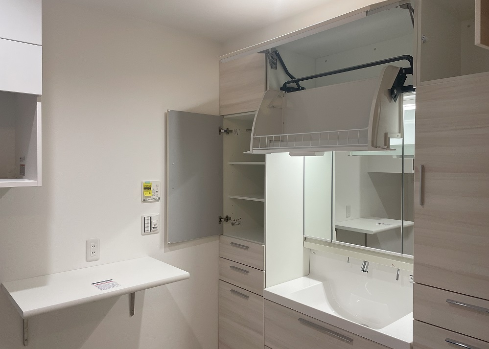 ・洗面所に大容量収納できる使い勝手の良い作り付け収納、カウンターを設置して家事楽
