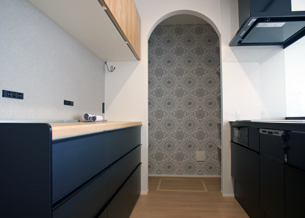 ・キッチン併設のパントリーは使い勝手が良く、柄物クロスを用いたお気に入りの空間