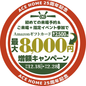 \2月末までのご来場キャンペーン/ 通常最大2,500円ですが、期間限定で今ならAmazonギフトカード最大8,000円分プレゼント ▶初めてのご来場(エースホームホームページにて3日前までの来場予約・ご来場) ▶別日に指定イベントの参加 ▶その他条件に該当されるお客様