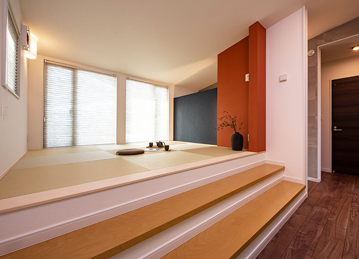 天井高さを高くするのが住宅設計のトレンドですが、実は高くてうれしいのはリビングだけ。他の部屋では高天井は無駄なばかりか、実は建築コストを押し上げる要因となります。本商品では独自の断面構造設計でリビング上部の2階床を上に移動。その結果リビングはハイサイドライトより光が降り注ぐ、天井高さ3.14mのラグジュアリーな空間となり、2階は床座に最適な安らぎの空間「プレイステージ」が生まれました。